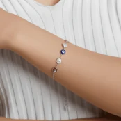 Pulsera Ojos de Alá, Plata de Ley 925, chapada en oro blanco, con nazars esmaltados multicolores y longitud ajustable.