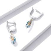 Pendientes Colgantes de Pluma, Plata de Ley 925, chapada en oro blanco, esmaltados con circonitas verdes.