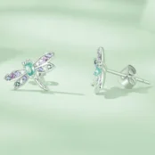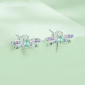Pendientes de Botón Libélula Plata de Ley 925, chapada en oro blanco, con circonitas de colores
