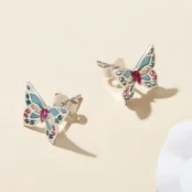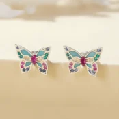 Pendientes de Botón Mariposas Plata de Ley 925, chapada en oro blanco, esmaltados a mano, con circonitas de colores