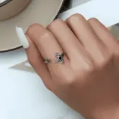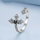 Anillo Cruz con Corazón Negro, Plata de Ley 925, chapada en oro blanco, con circonitas negras – ajustable.
