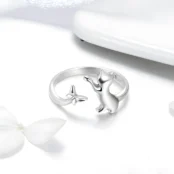 Anillo de Gato con Mariposa, Plata de Ley 925, chapada en oro blanco – ajustable.